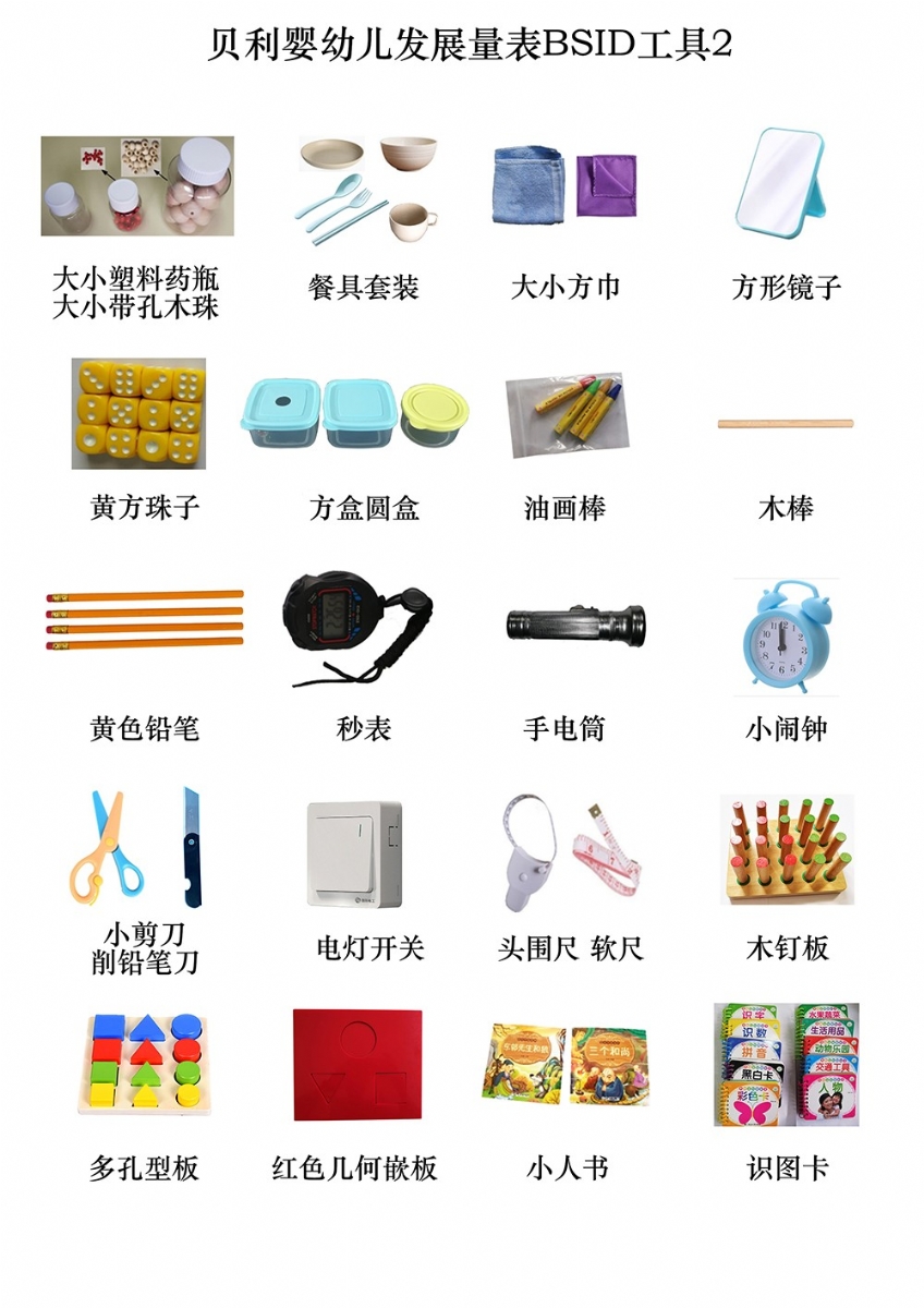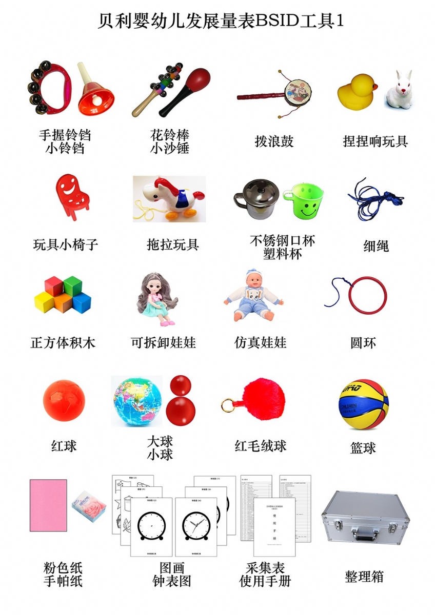 手握鈴鐺、小鈴鐺、花鈴棒、撥浪鼓、小沙錘、捏捏響玩具、玩具小椅子、拖拉玩具(帶線)、小正方體積木(紅12個,黃藍綠各2塊)、可拆卸娃娃、布娃娃、圓環(huán)、紅球、大球、紅毛絨球、籃球、紅色小球、細繩、不銹鋼口杯、塑料杯、大號塑料藥瓶、小號塑料藥瓶、餐具套裝、大小方巾、方形鏡子、大木珠(帶孔)、小木珠(帶孔、)黃方珠子、塑料方盒、塑料圓盒、油畫棒、指揮棒、黃色鉛筆、秒表、手電筒、小鬧鐘、電燈開關、頭圍尺、軟尺、木釘板、多孔型板(含圓形、方形、三角形各4塊)、幾何嵌板(含圓、三角、方形,厚8mm)、小人書識圖卡(果蔬、人物、動物、交通等)、粉色卡紙、手帕紙、鐘表圖1234、圖畫12(BSID)、BSID采集表、BSID使用手冊、整理箱等。